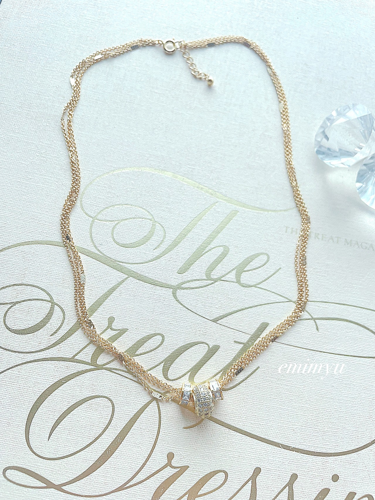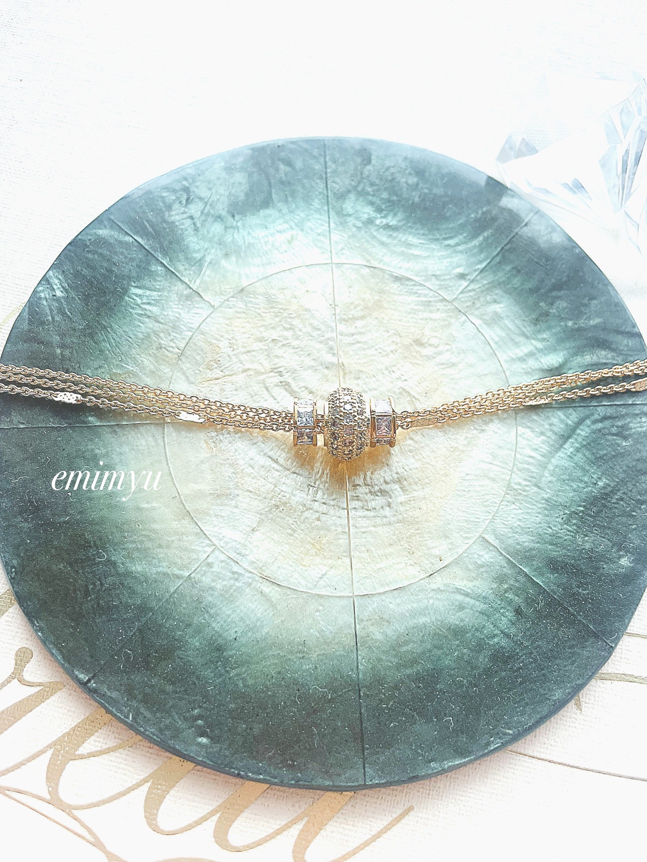 Triple Design Rondel Triple Chain Gold Necklaceは、華やかさと洗練されたデザインが魅力のネックレスです。