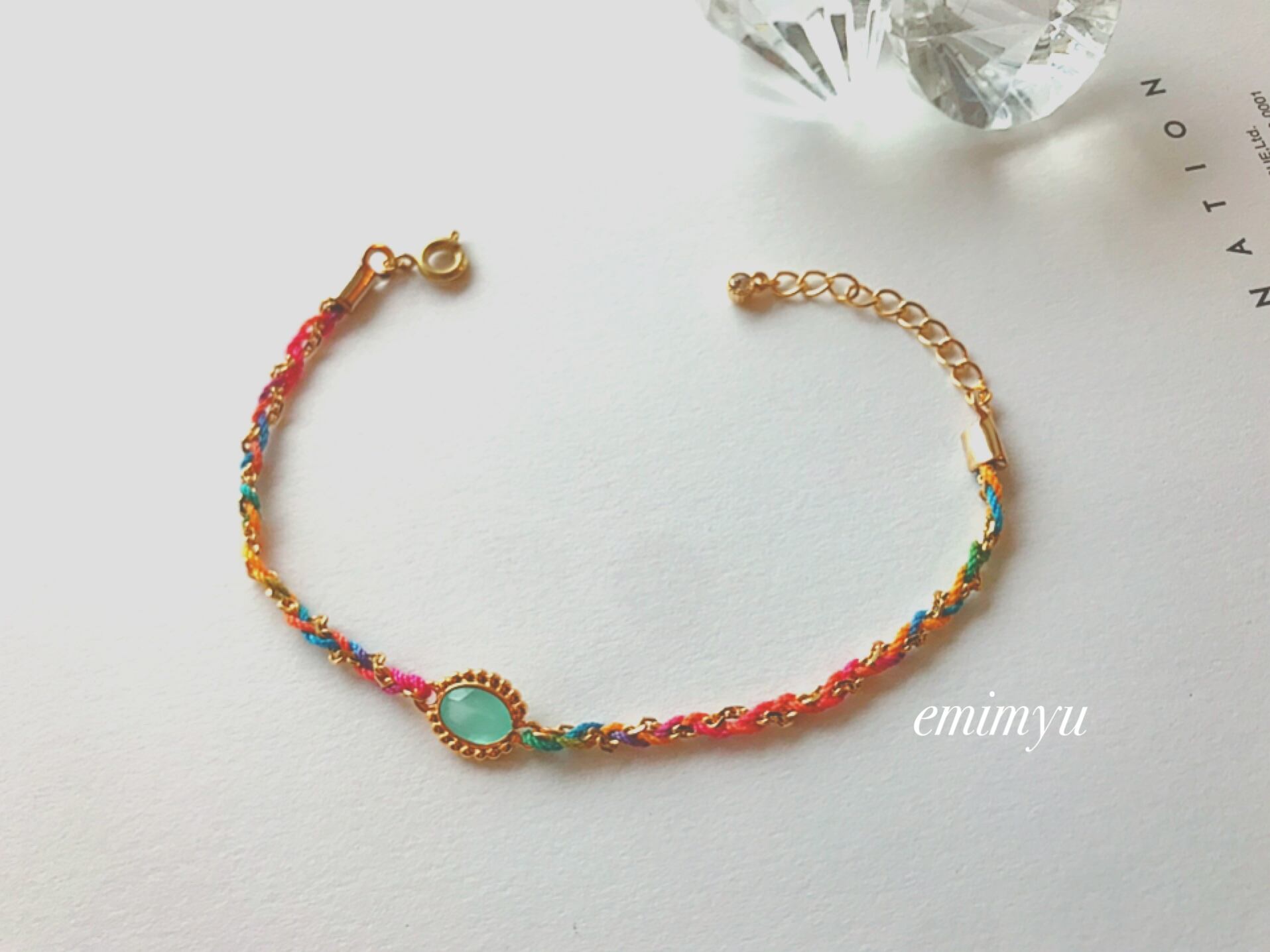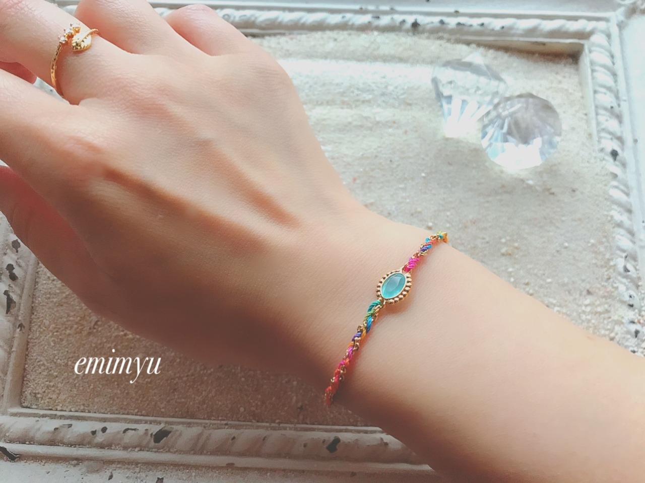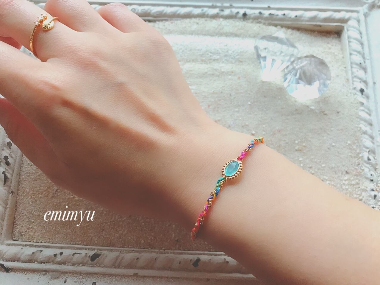 とても綺麗なスカイブルーのシャネルストーンパーツをメインにレインボーカラーのコードとキラキラと輝くゴールドチェーンを編み込んだアクセントのきいたオシャレなブレスレット