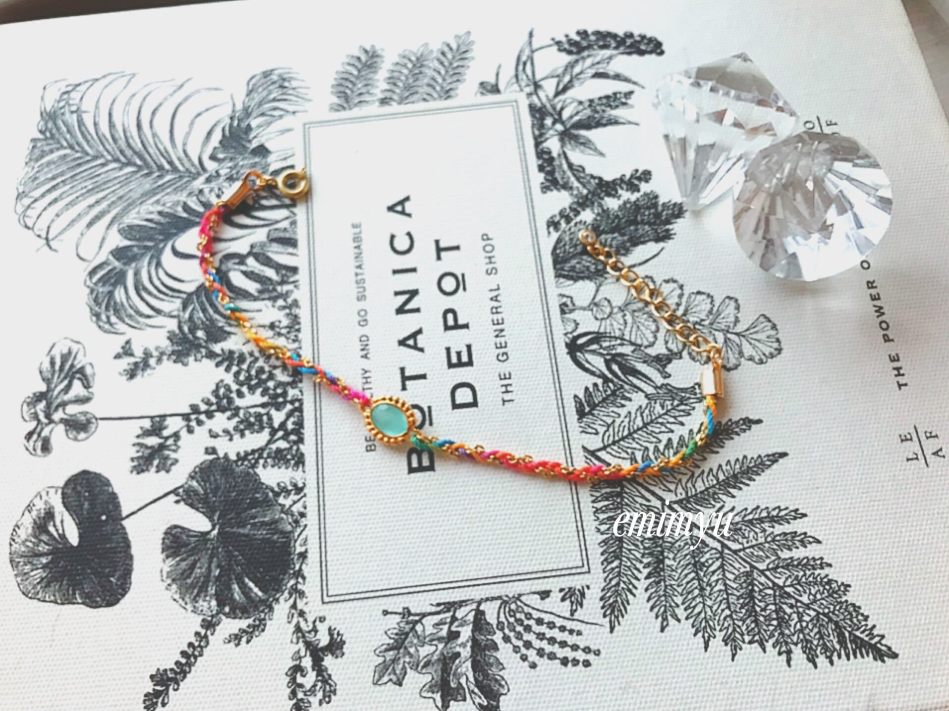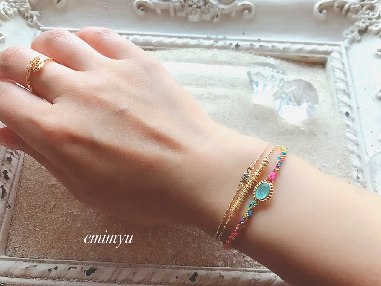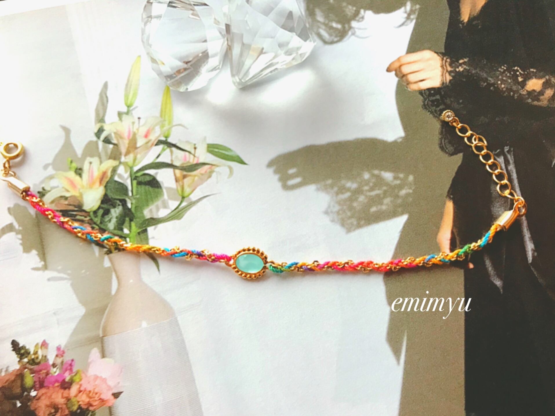 とても綺麗なスカイブルーのシャネルストーンパーツをメインにレインボーカラーのコードとキラキラと輝くゴールドチェーンを編み込んだアクセントのきいたオシャレなブレスレット