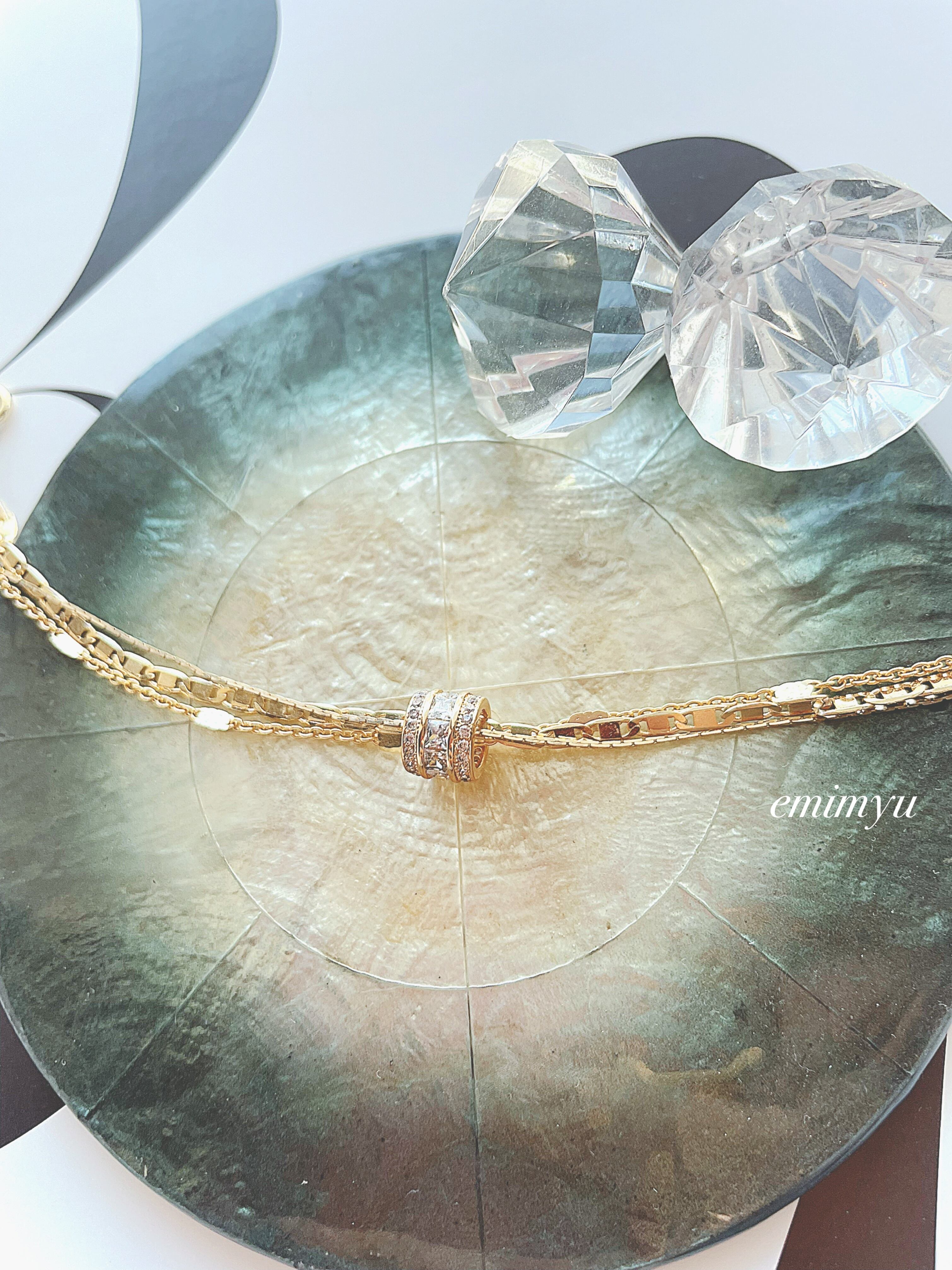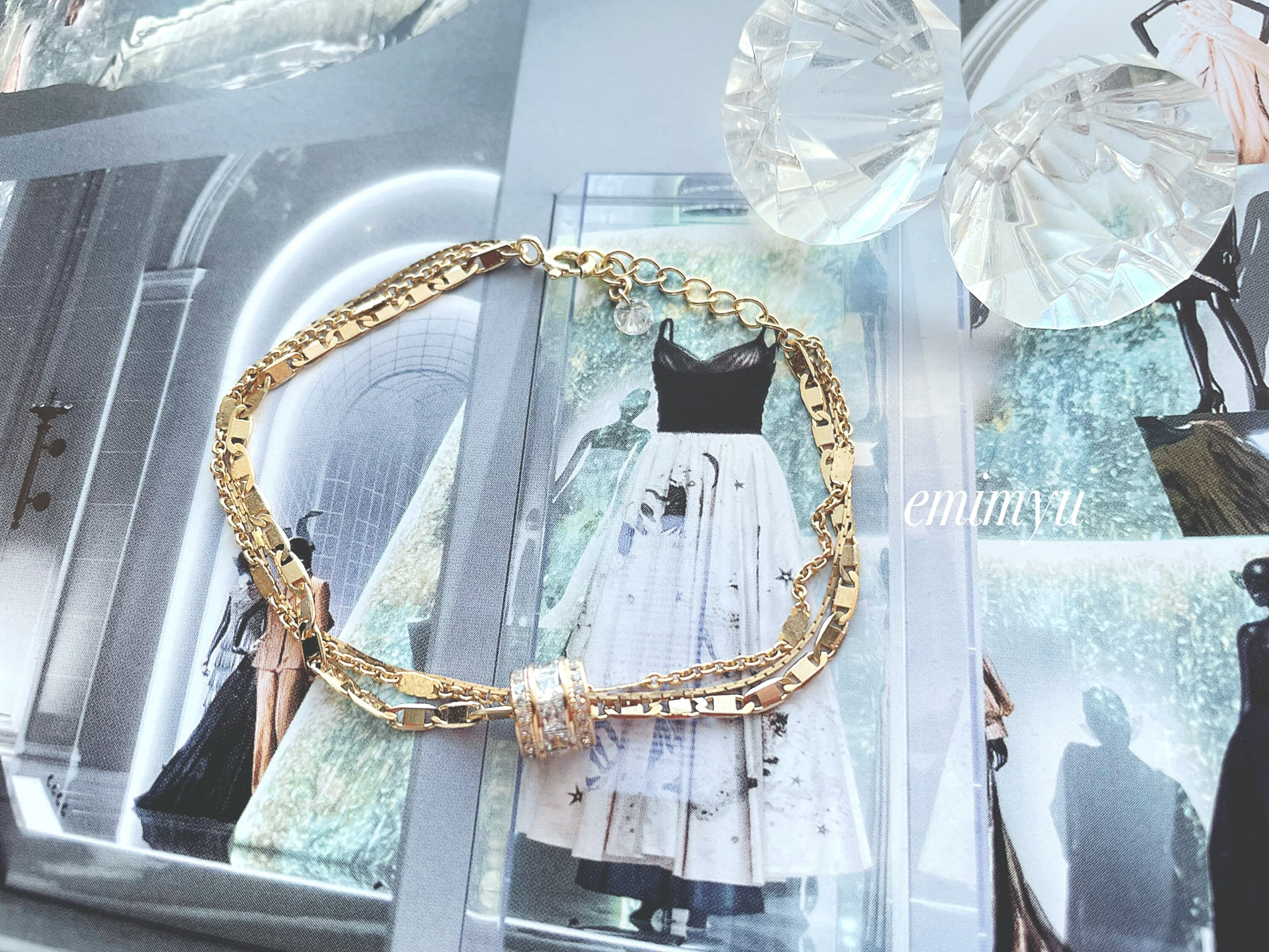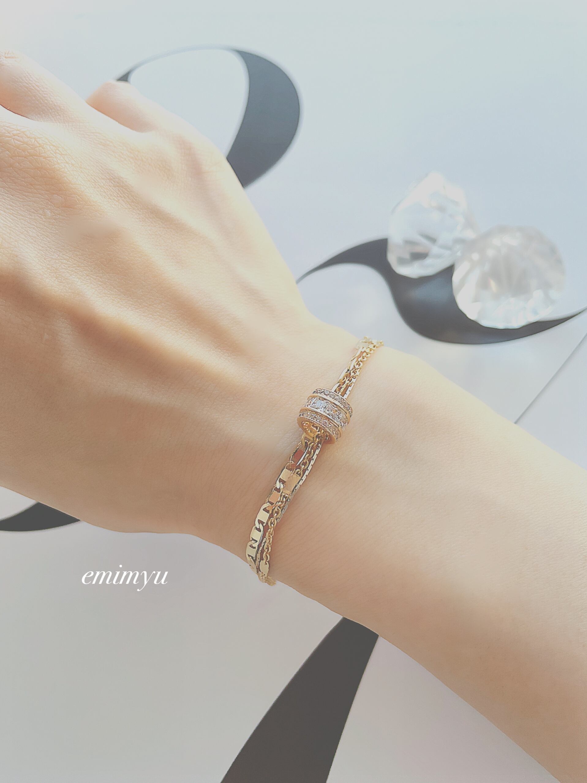 異なる3連のチェーンと綺麗なクリスタル入りのロンデルを組み合わせたラグジュアリーな仕上がりのブレスレット