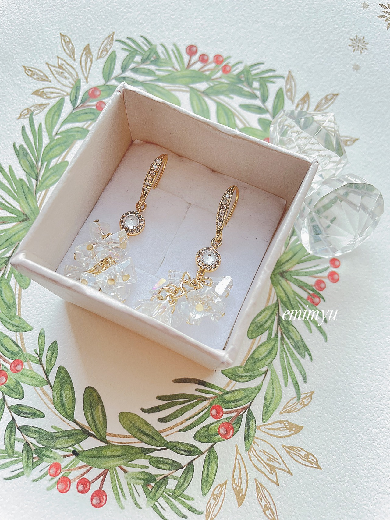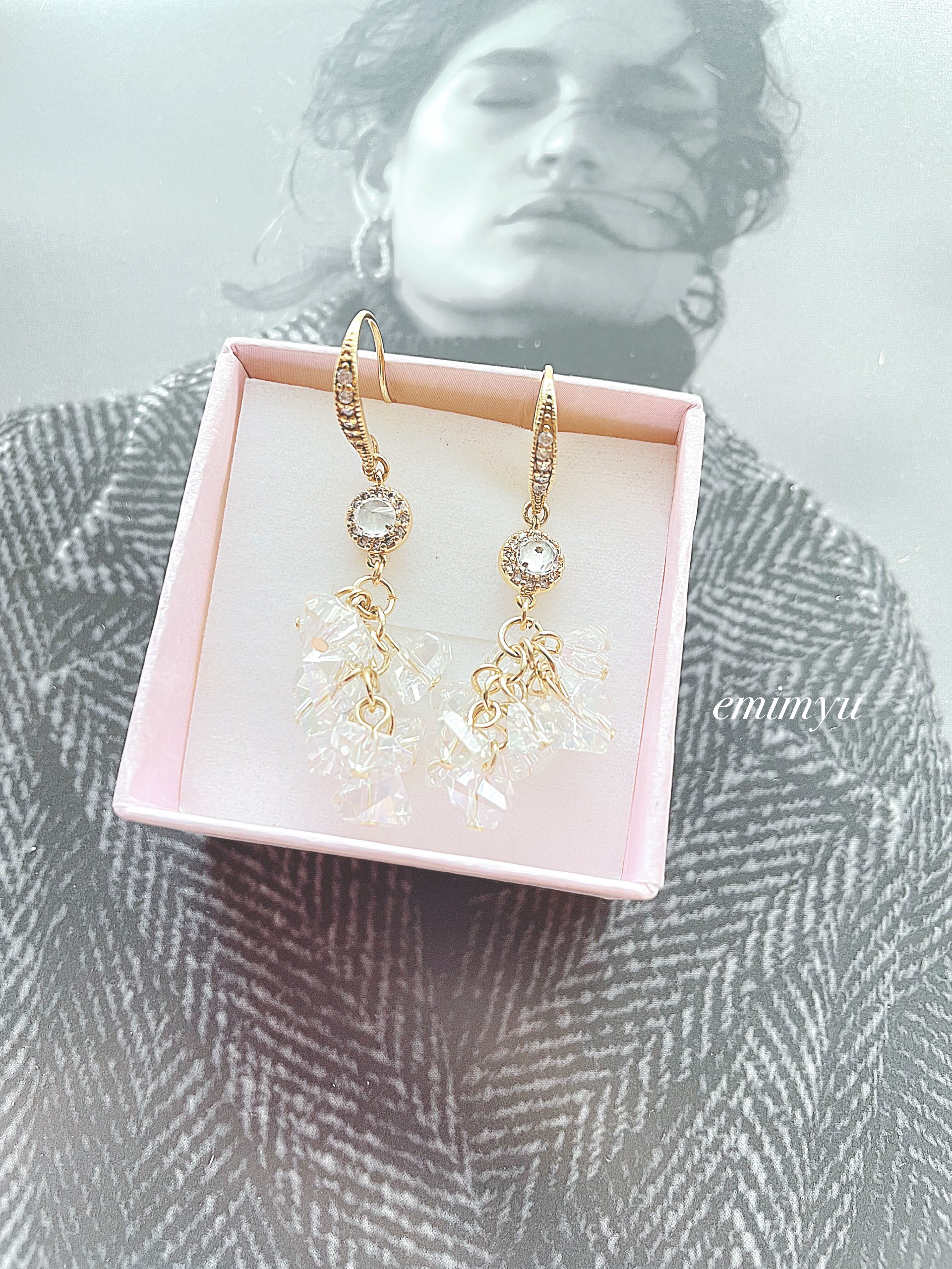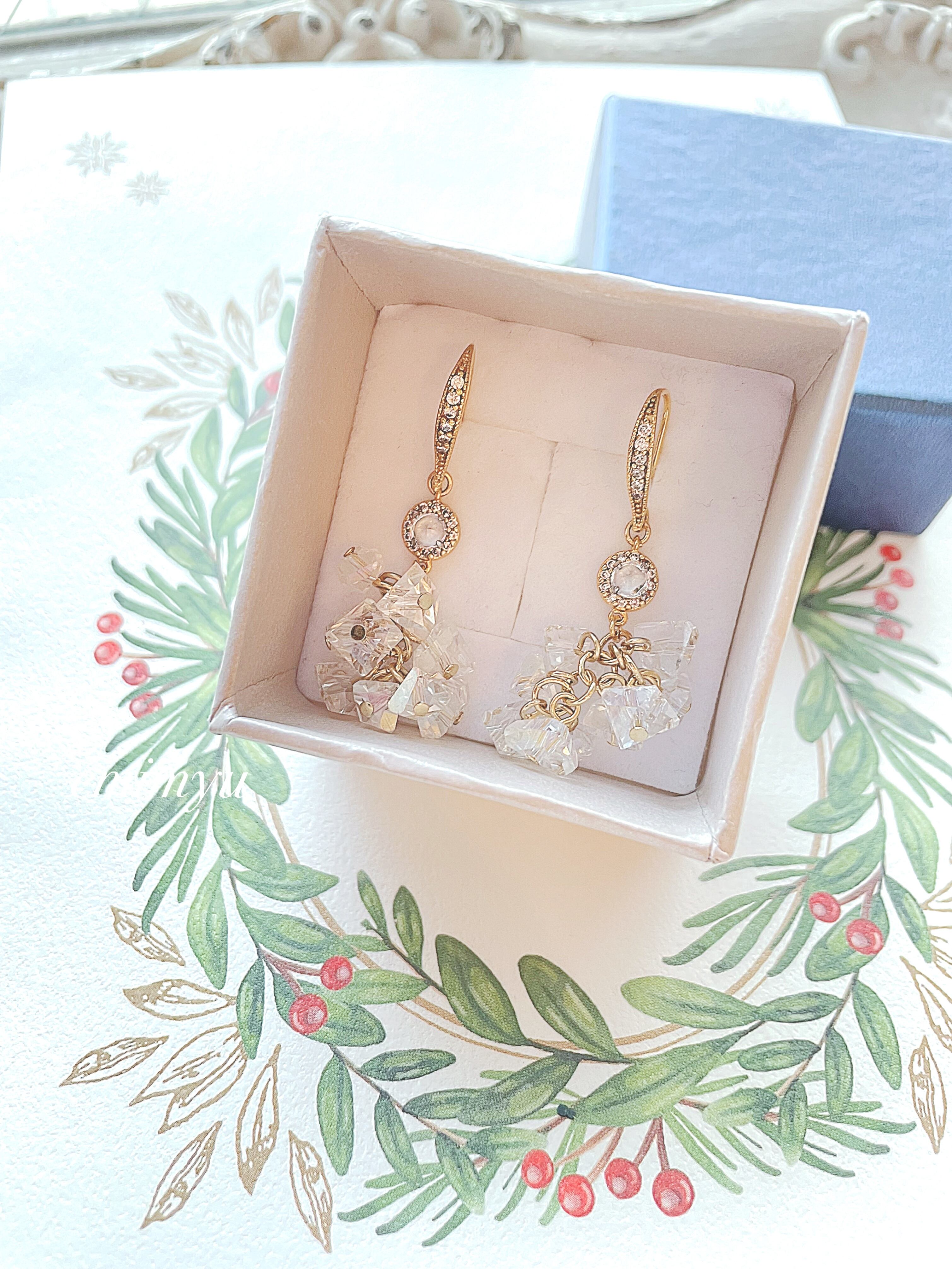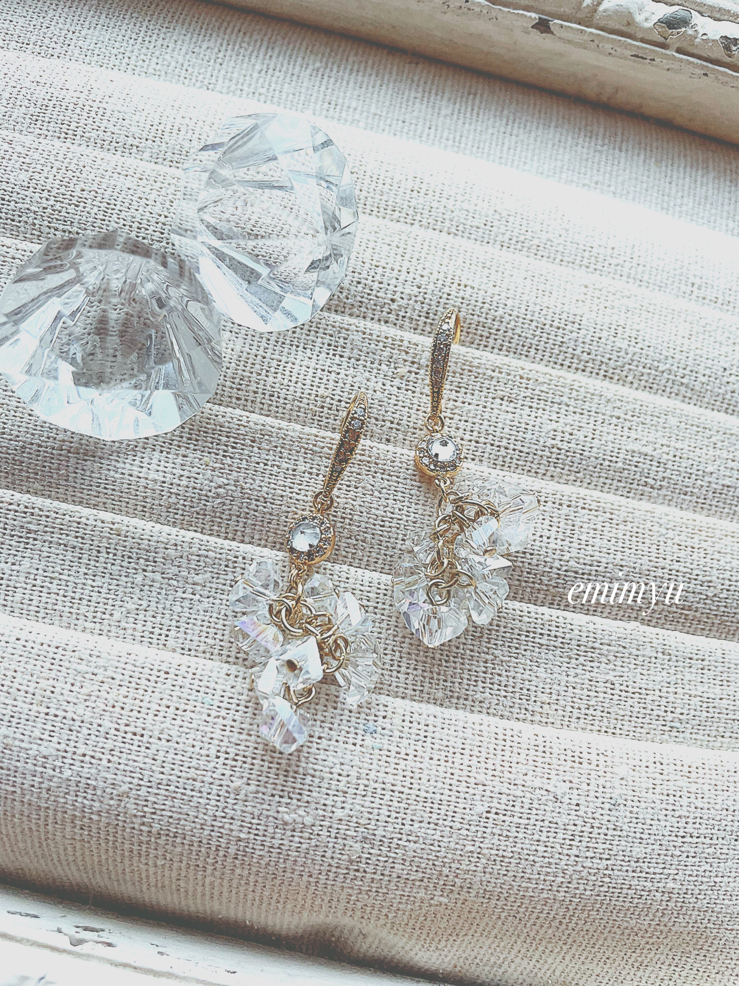 クリスタルさざれパーツとジルコニアのパーツとピアスを組み合わせた雪の様なピアス