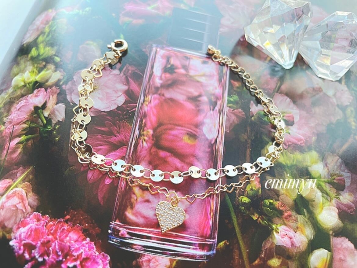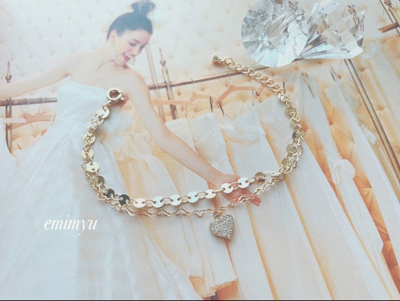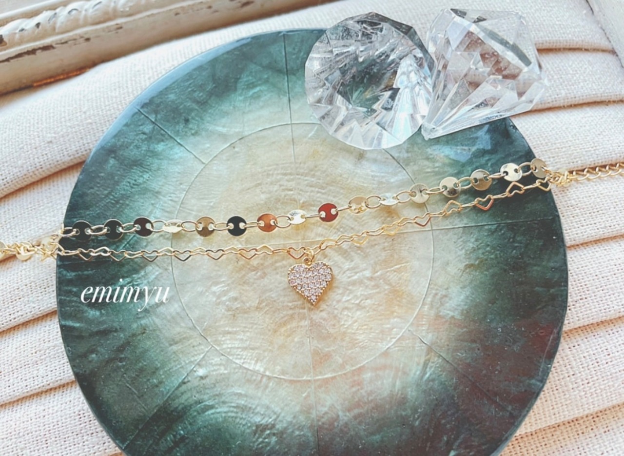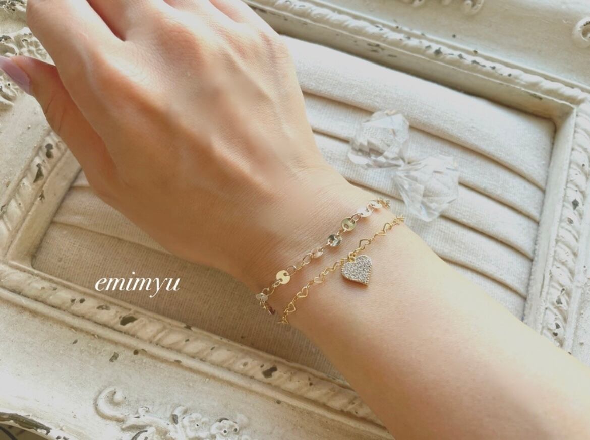 ラウンドチェーンパーツとハートチェーンを組み合わせてポイントにハートチャームを付けたブレスレット