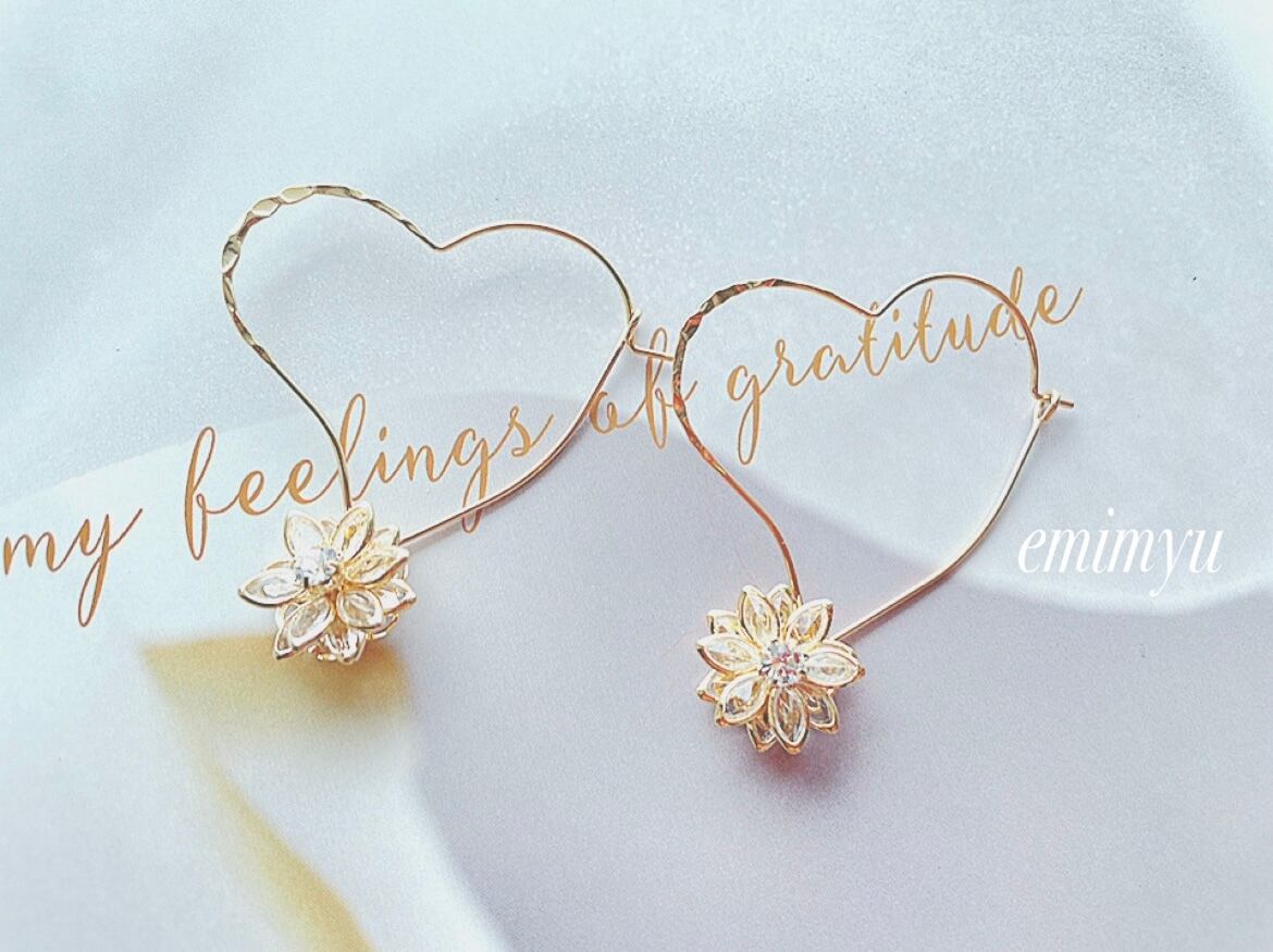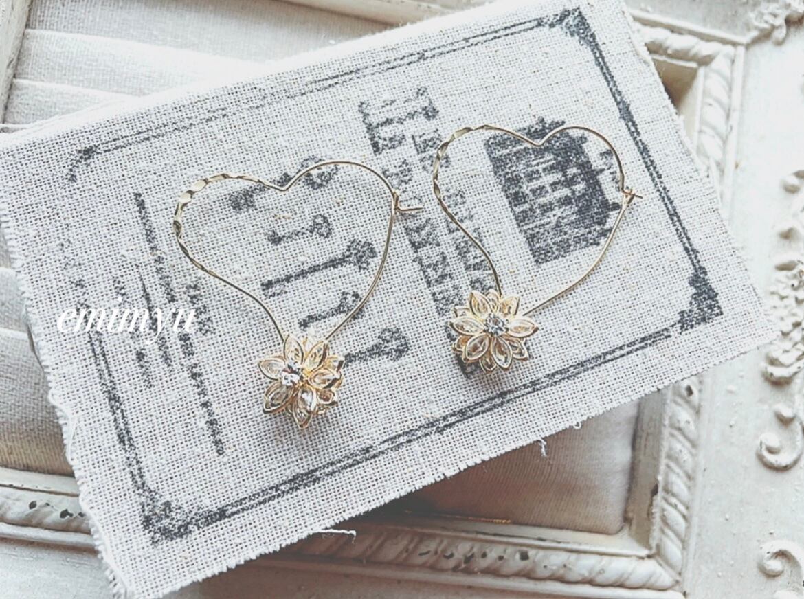 大きめのデザインハートピアスにクリスタルフラワーパーツを組み合わせたピアス