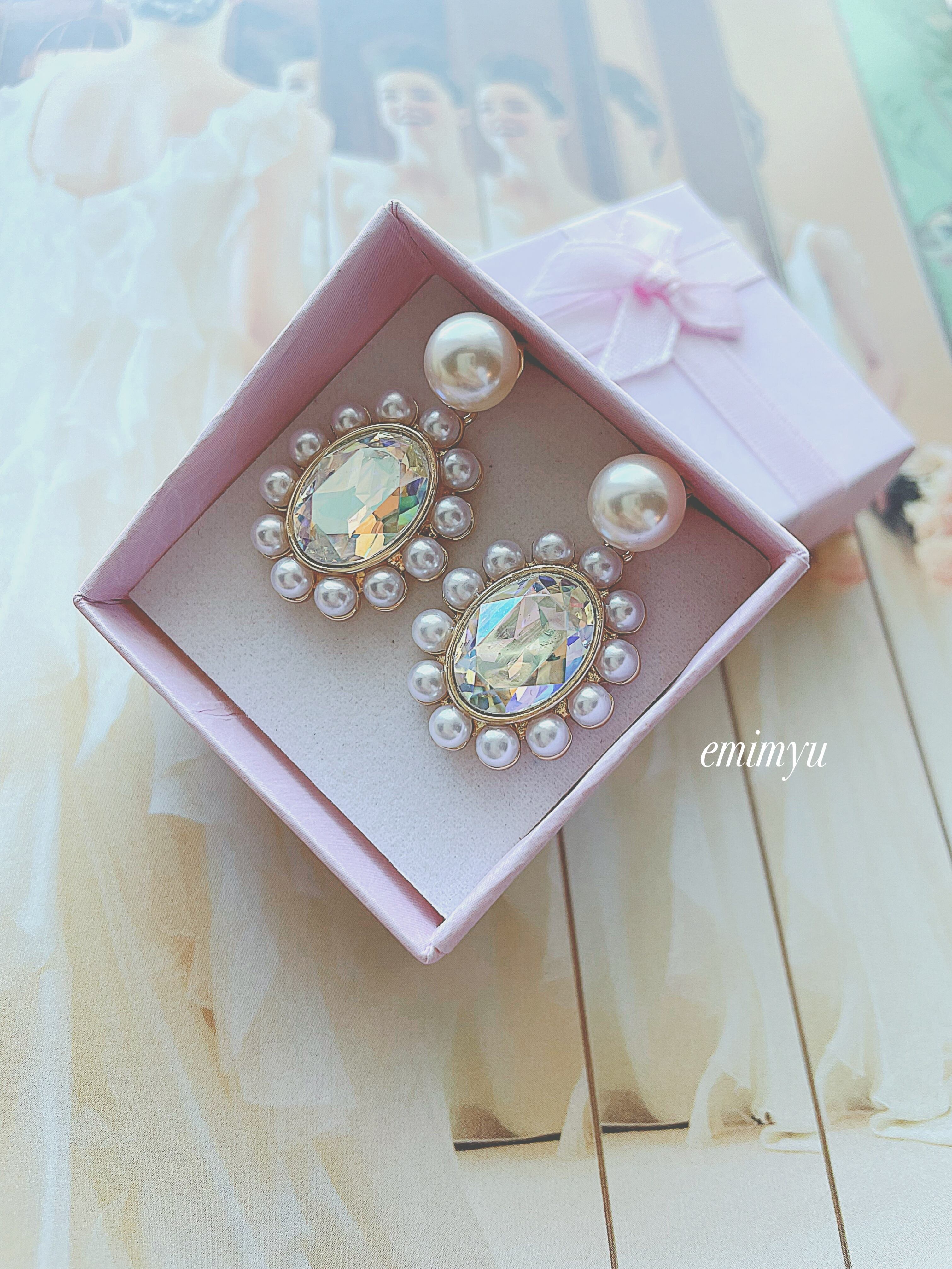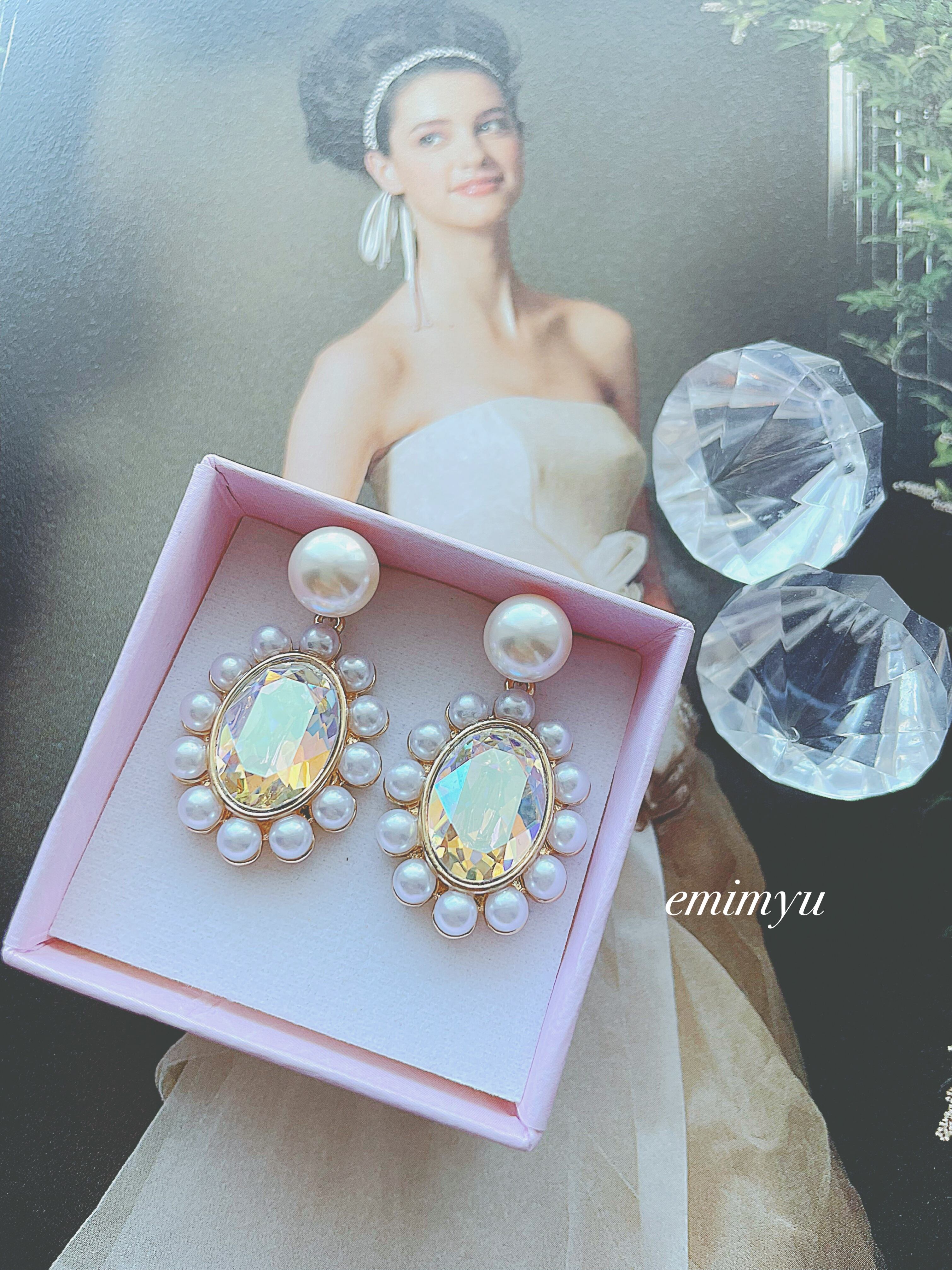 上品で華やかなパールとスワロフスキー社のクリスタルを使用したピアス。洗練されたデザインが特徴です。