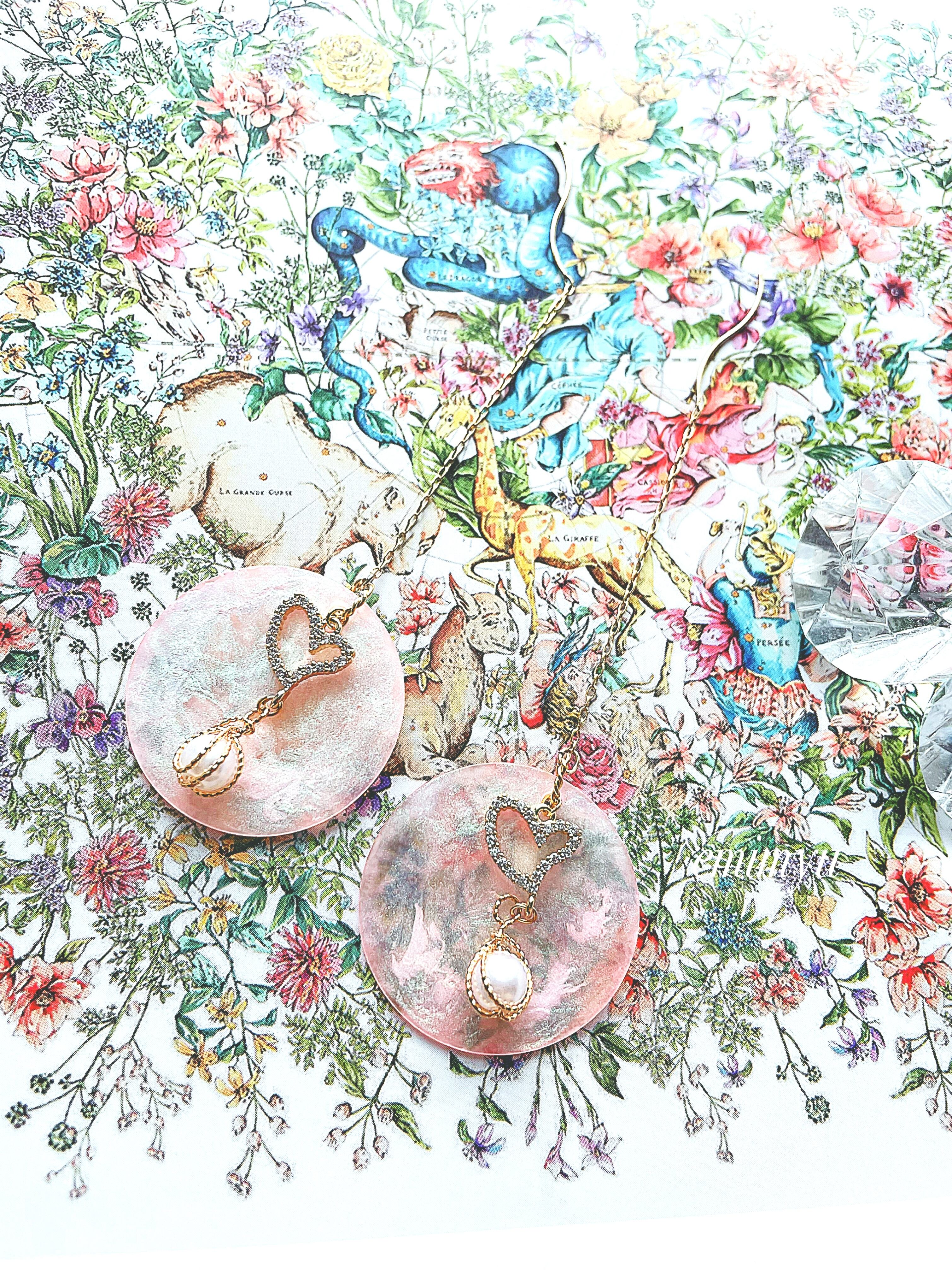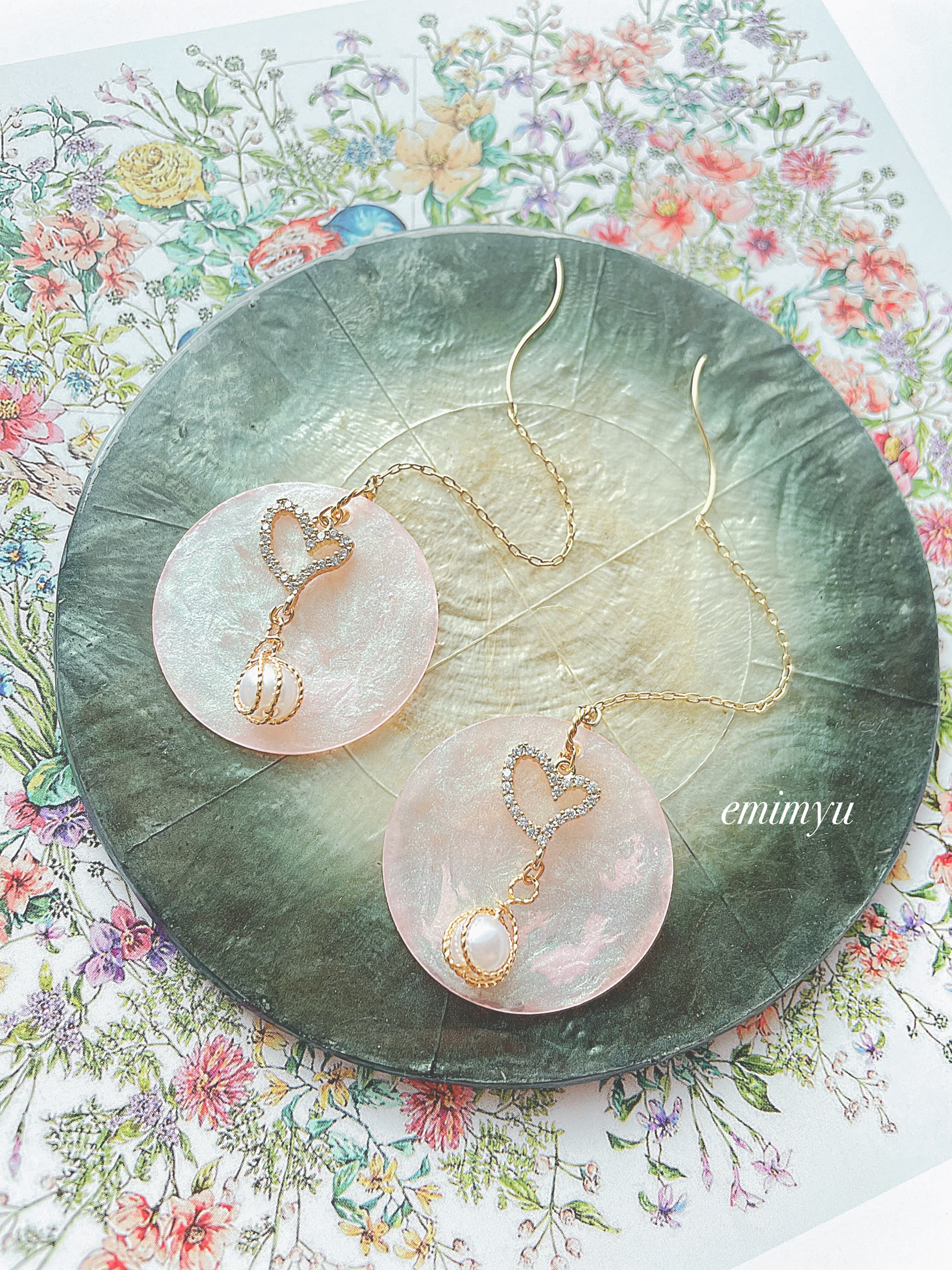 ピンク色の貝殻とハート形のジルコニアとエレガントなパールが組み合わさった、まるで宝石のような輝きが魅力です。